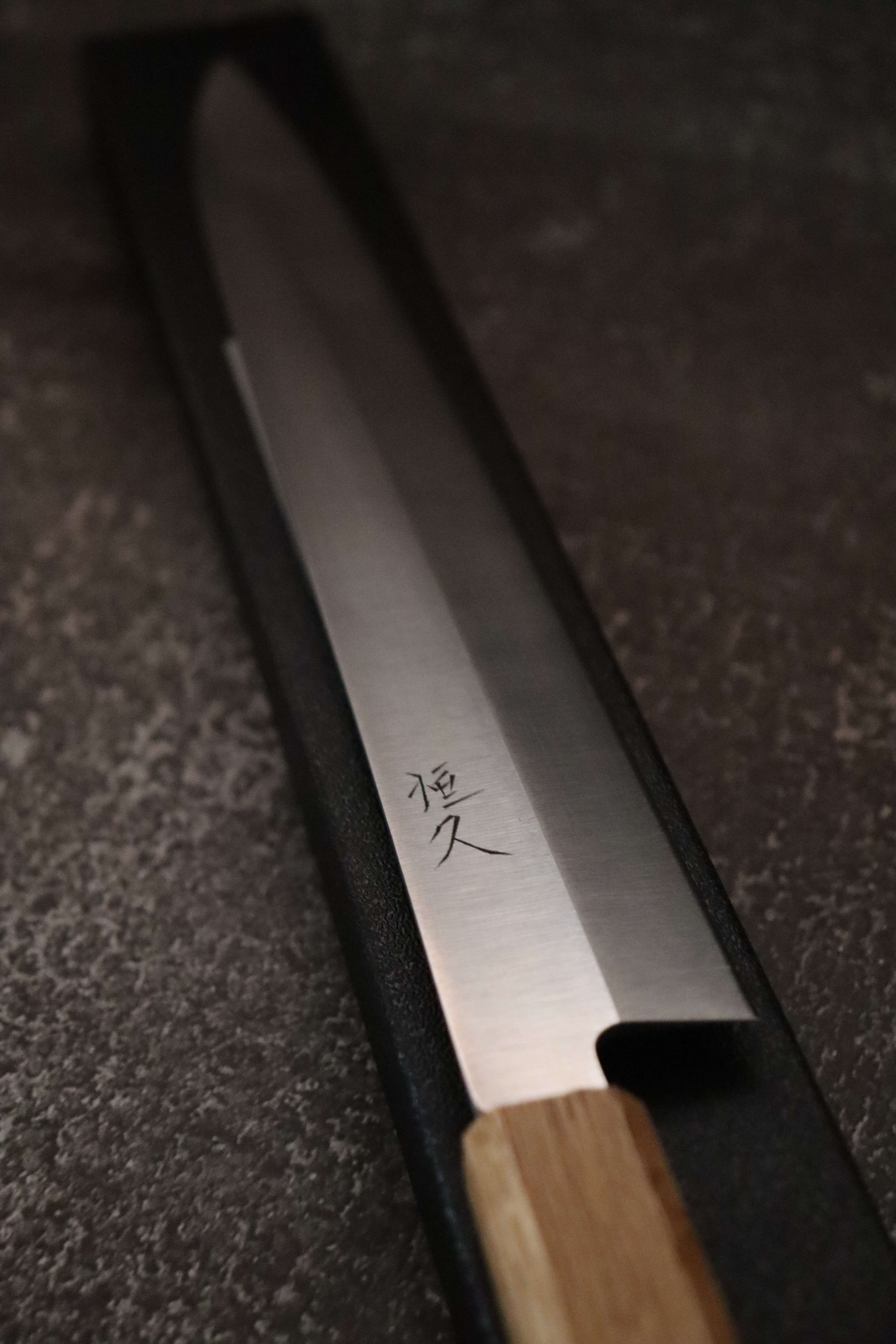 Cuchillo Yanagiba es una pieza tradicional de la cocina japonesa, especialmente diseñado para el arte del sashimi y el sushi. Su hoja larga, delgada y de un solo filo permite realizar cortes extremadamente precisos y suaves, esenciales para mantener la textura y frescura de pescados y mariscos crudos. Gracias a su diseño, el Yanagiba minimiza la pérdida de jugos y reduce el daño en las fibras de los ingredientes, logrando cortes limpios y presentaciones impecables. Utilizado principalmente por chefs profesionales, este cuchillo requiere técnica y práctica, pero en manos expertas, ofrece un control excepcional. Elegante y especializado, el Yanagiba no solo es una herramienta, sino una extensión del arte culinario japonés.